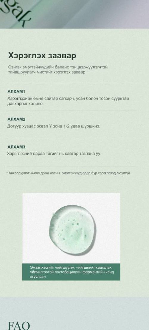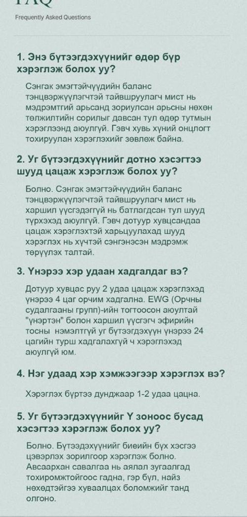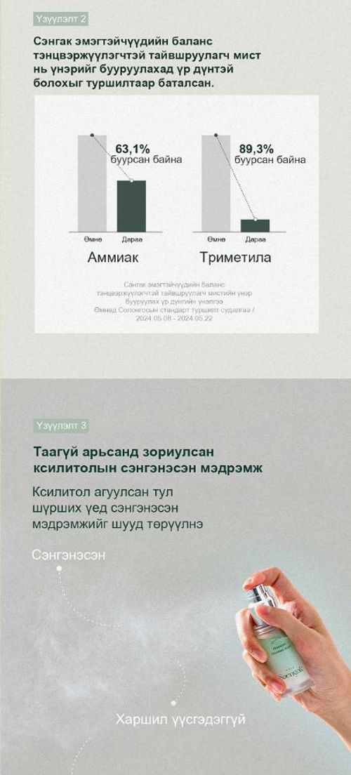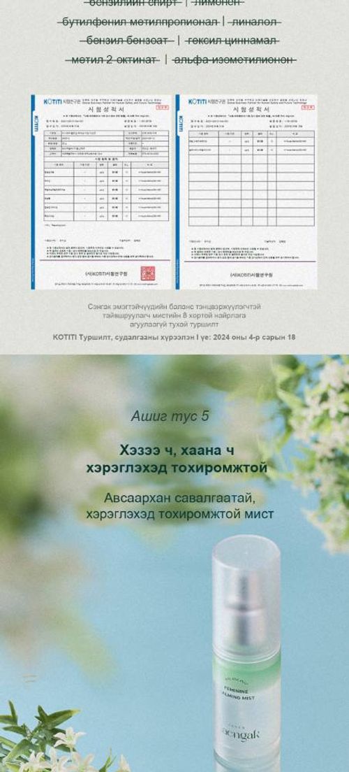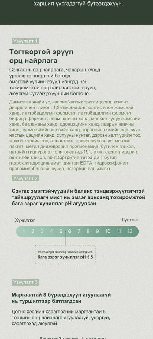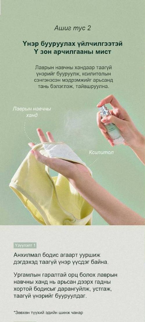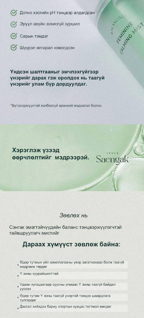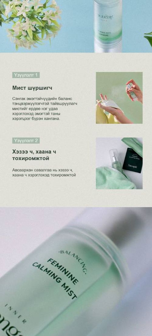 Эмэгтэйчүүдийн тайвшруулагч мист нь дотно хэсгийн рН-ийн тэнцвэрт байдлыг сэргээх, тайвшруулах үйлчилгээтэй. Дамаск сарнайн ханд, одонцэцэг, Симкалмин комплекс, пробиотик зэрэг байгалийн гаралтай орц найрлага бүхий энэхүү мист нь хувийн эрүүл ахуйг бүрэн хангана. Мөн холибазилийн навчны хандаар таагүй үнэрийг багасгахын зэрэгцээ ксилитолын сэнгэнэсэн мэдрэмжийг арьсанд өгч тайвшруулна.