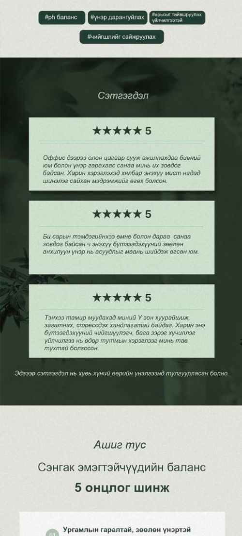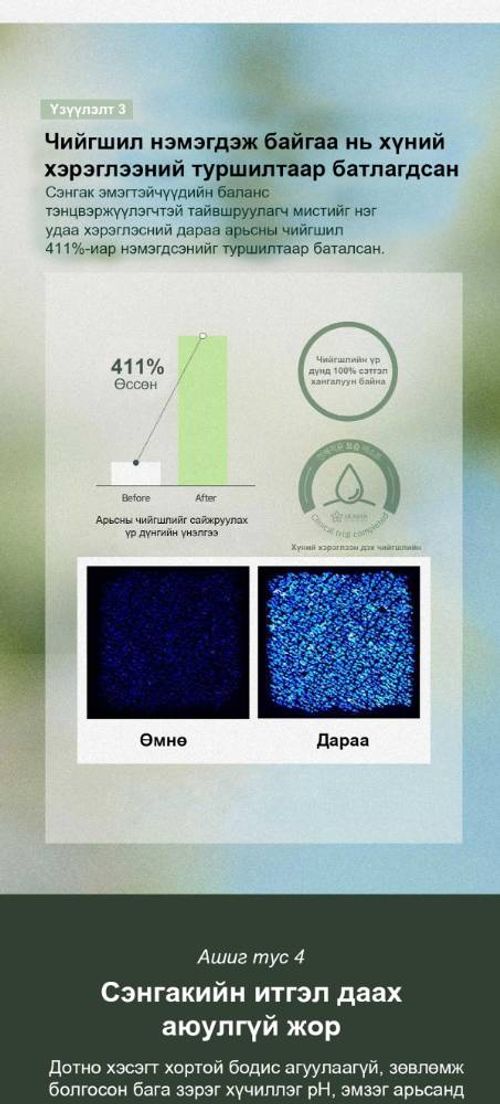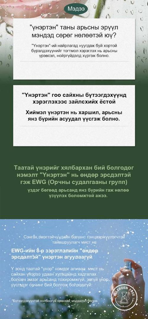Байгалийн чийгшүүлэгч мист нь хуурайшилт, өвдөлт, загатнаа болон таагүй үнэрийг дарж, нөхөн сэргээдэг.