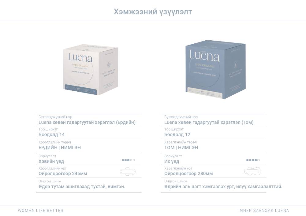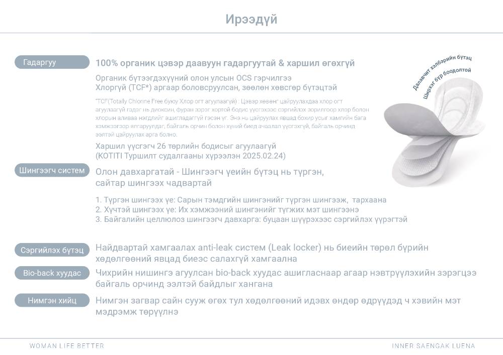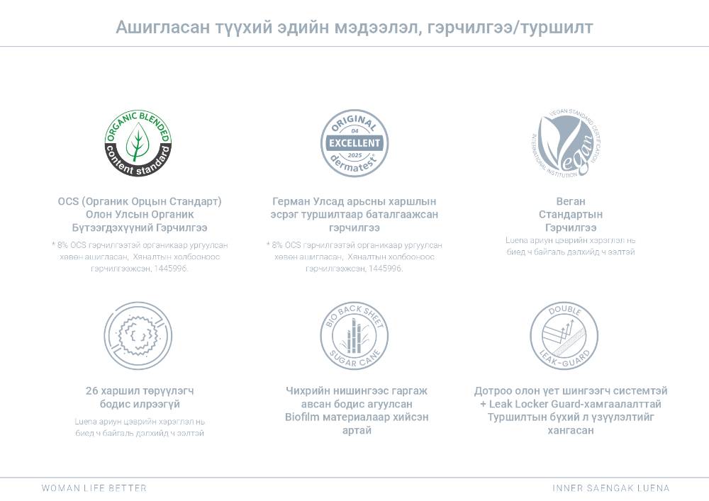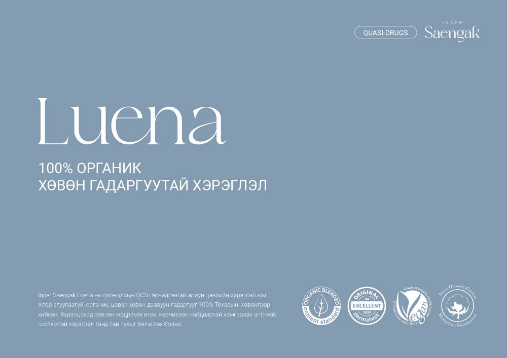 Inner Saengak Luena нь олон улсын OCS гэрчилгээтэй ариун цэврийн хэрэглэл юм.